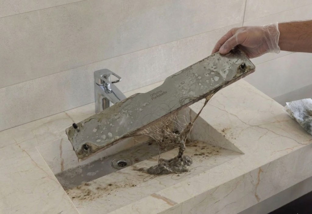 A pia esculpida é muito valorizada pelo visual moderno e integrado. No entanto, o ralo oculto pode dificultar o escoamento da água e acumular sujeira com mais facilidade.
