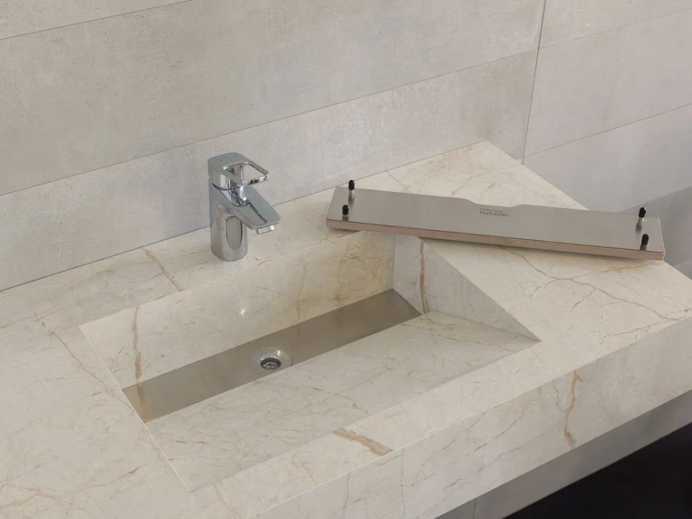 O porcelanato é um material resistente e sofisticado, mas seu uso em pias pode exigir mão de obra altamente especializada.