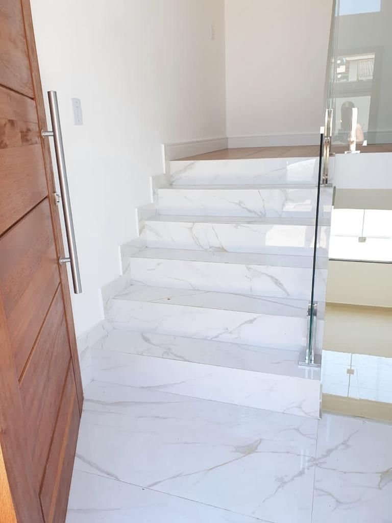 Apesar de elegante, a escada em porcelanato pode apresentar riscos de escorregamento, principalmente em áreas internas com uso frequente.