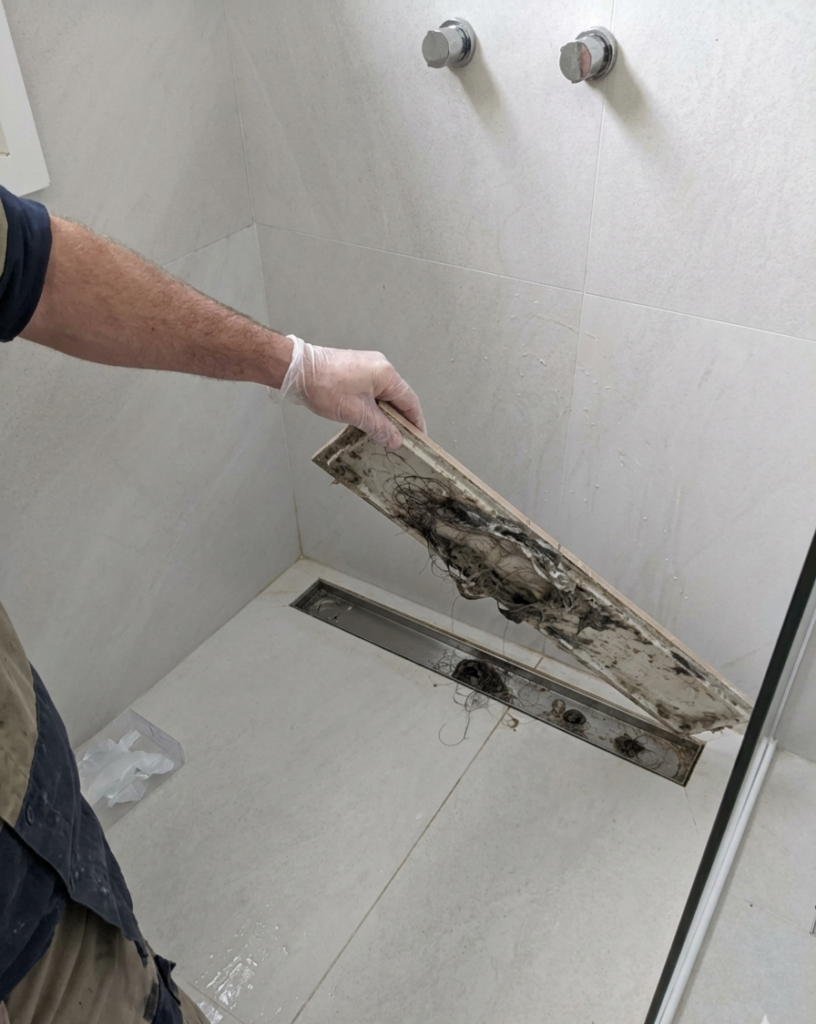 O ralo oculto no box segue a mesma linha estética, mas pode apresentar limitações no escoamento da água.